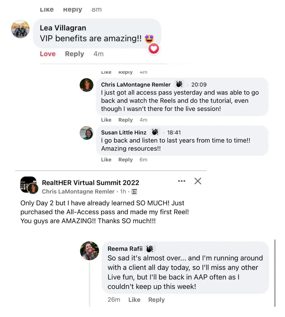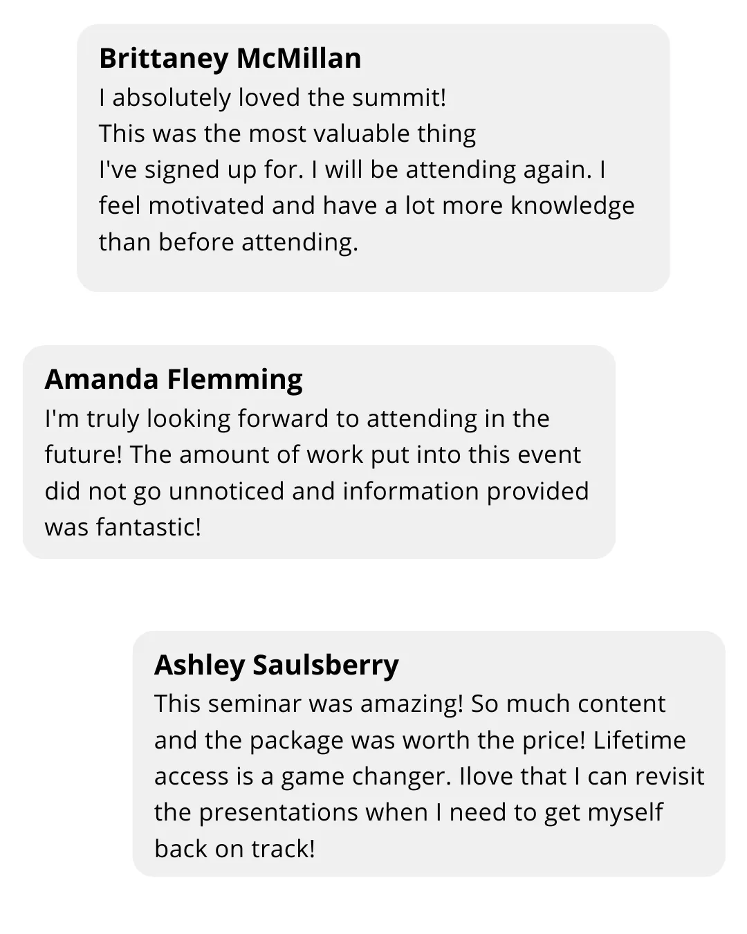 There is ✨ magic ✨ that happens when you attend the summit live but we know that life (and your business) can pop up during the week! That's why you have access to all presentations for 24 hours before they go into the VIP vault.
